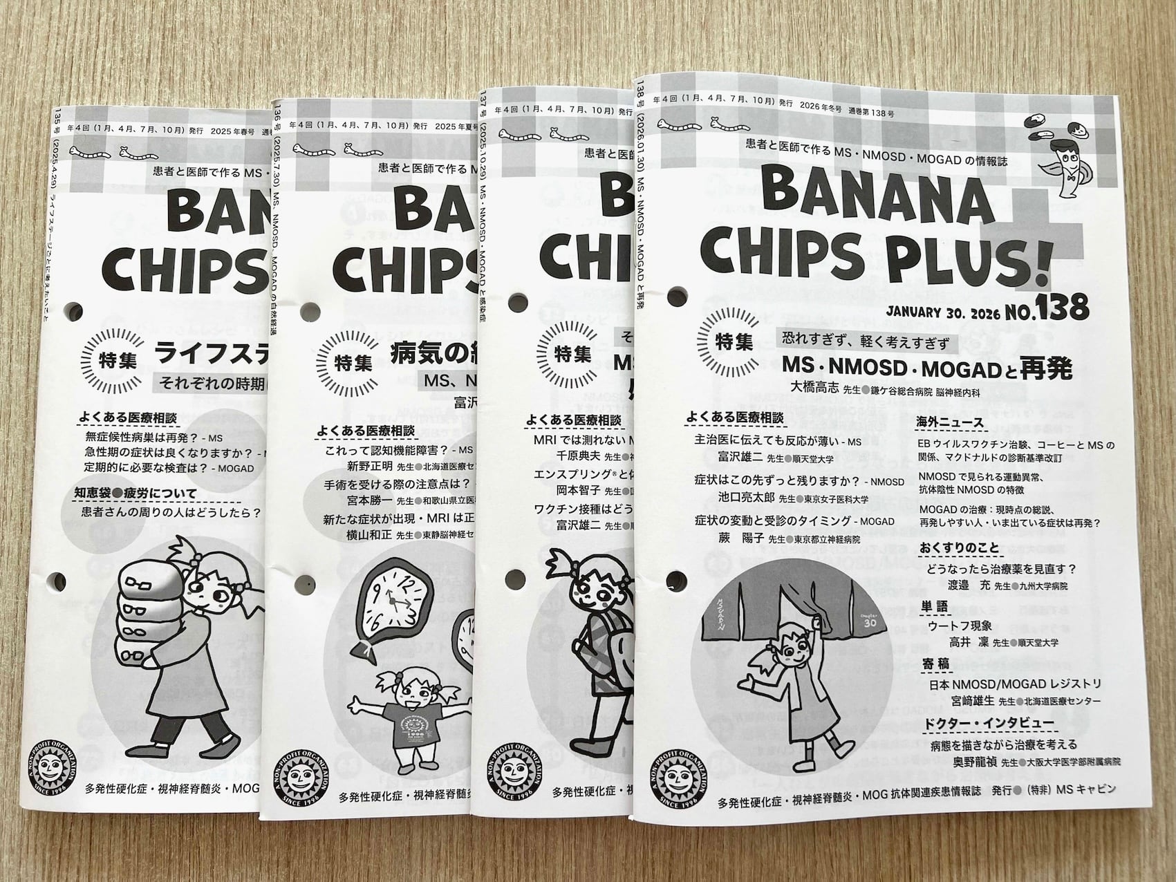 バナナチップスPlusは、そんな多発性硬化症(MS)、視神経脊髄炎(NMOSD)、MOG抗体関連疾患(MOGAD)の患者さんとご家族のためにつくられた情報誌です。